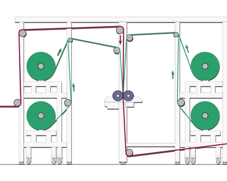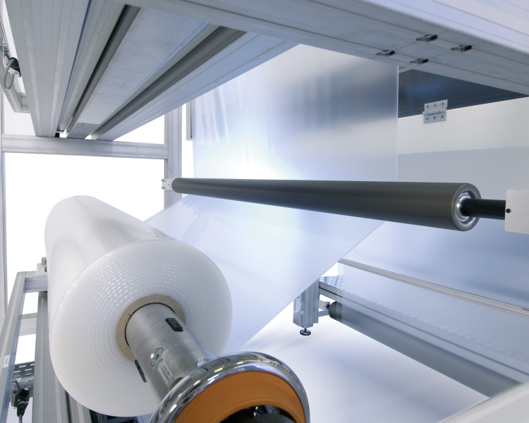 Das macht die Entscheidung fürs Kaschieren fast so leicht, wie die Bedienung. Denn das Einfädeln der Kaschierfolie in den Kaschierspalt ist denkbar einfach. Die leichte Handhabung ermöglicht ein schnelles und sicheres Anlegen, bzw. Wechseln der Folie. Dank der axialen Verstellmöglichkeit der einzelnen Wickelwellen kann die Kaschierfolie immer optimal zur extrudierten Folie zentriert werden. Mit feinfühlig einstellbaren Magnetpulverbremsen, die über den gesamten Wickeldurchmesser eine gleich bleibende Zugkraft garantieren, lässt sich die Kaschierfolie gleichmässig und spannungsarm auflegen.